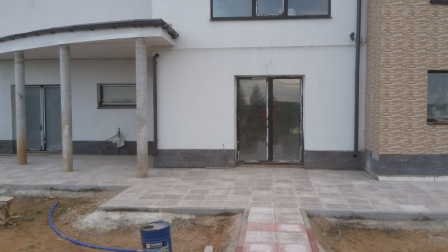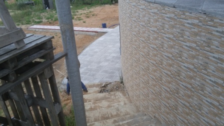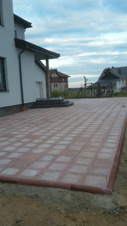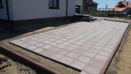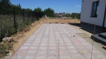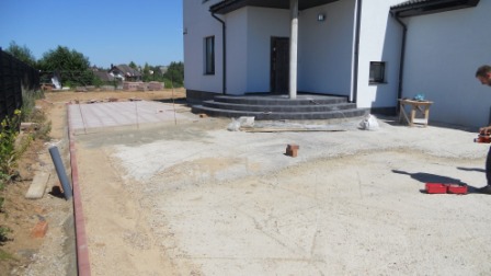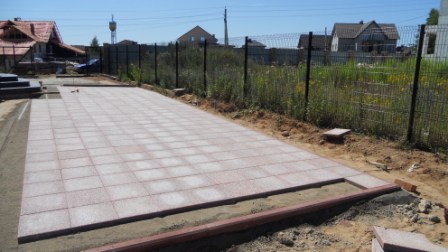 На парковке под заезд автомобиля и на отмостке тротуарная плитка уложена на бетонную подготовку