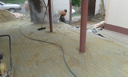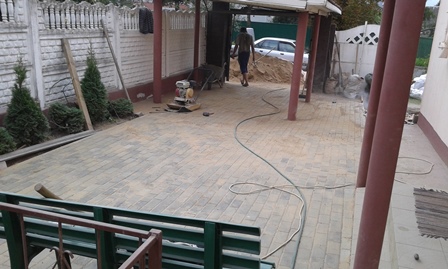 Укладка вибропрессованой тротуарной плитки, установка бордюров.