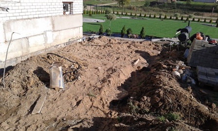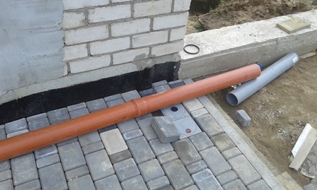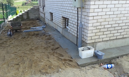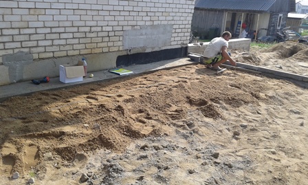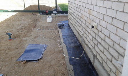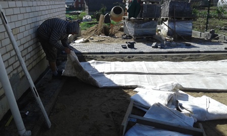 На отмостке плитка уложена на бетонную подготовку, оклееную наплавляемой гидроизоляцией