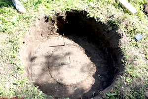Итак, в начале копаем яму метровой глубины и немногим больше метра в диаметре. Затем опускаем туда первое кольцо, далее все просто, выбираем грунт и кольцо под собственным весом углубляется. Далее устанавливают второе кольцо, опять выбирают грунт и так далее. Этот метод является очень безопасным, так как обрушение стенок сводится к минимуму.