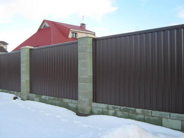 Забор из профнастила - один из самых популярных видов ограждений. Свою популярность он получил за свои изолирующие свойства, и умеренную цену. Заборы из профнастила дают волю фантазии, т.к. профнастил можно комбинировать с кирпичными и бетонными столбами, или с бетонными пролетами.