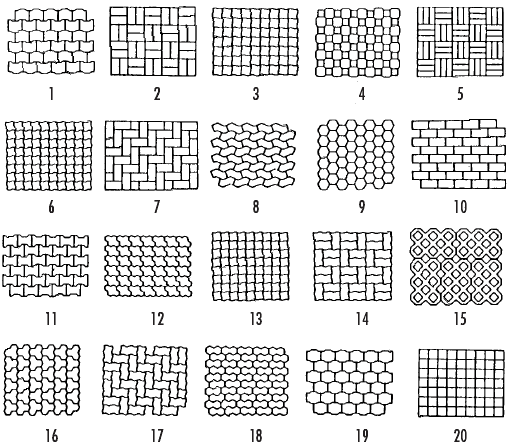 Несложные рисунки для создания узоров на тротуарной плитке прямоугольной и фигурной формы. Для создания эффектного узора можно использовать только два цвета. В первом ряду на второй иллюстрации — елочка, в четвертом ряду на второй иллюстрации — плетенка